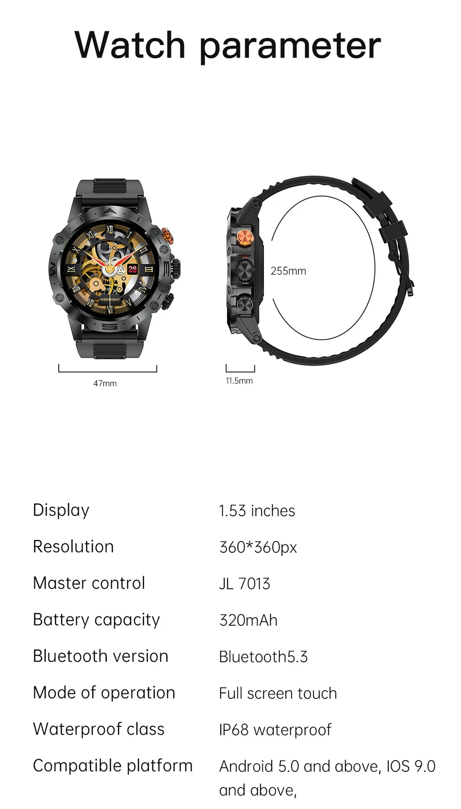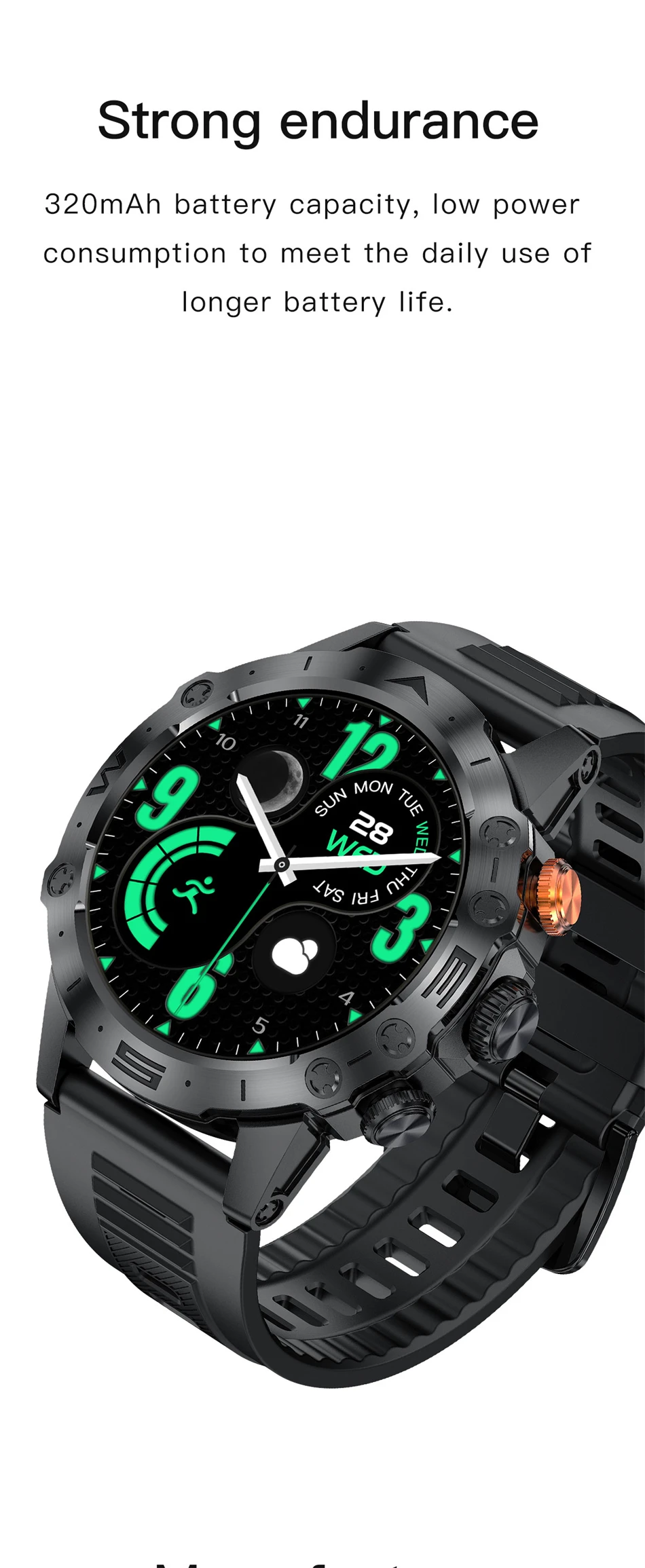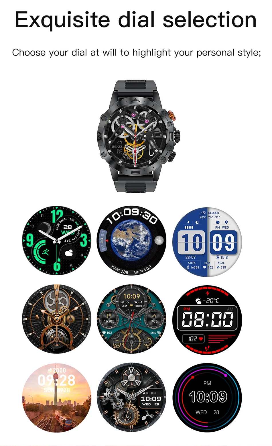 - Function: Passometer,fitness tracker,sleep tracker,Mood Tracker,Message Reminder,Call Reminder,Answer Call,Dial Call,Remote Control,Push Message,Tourbillon,Big Three Needles,24 hour instruction,Chronograph,Alarm Clock,Small Second,World Time,Permanent Calendar,Power Reserve,Phase of the Moon,Month,Heart Rate Tracker,Interactive Music,Calendar,Oxymeter