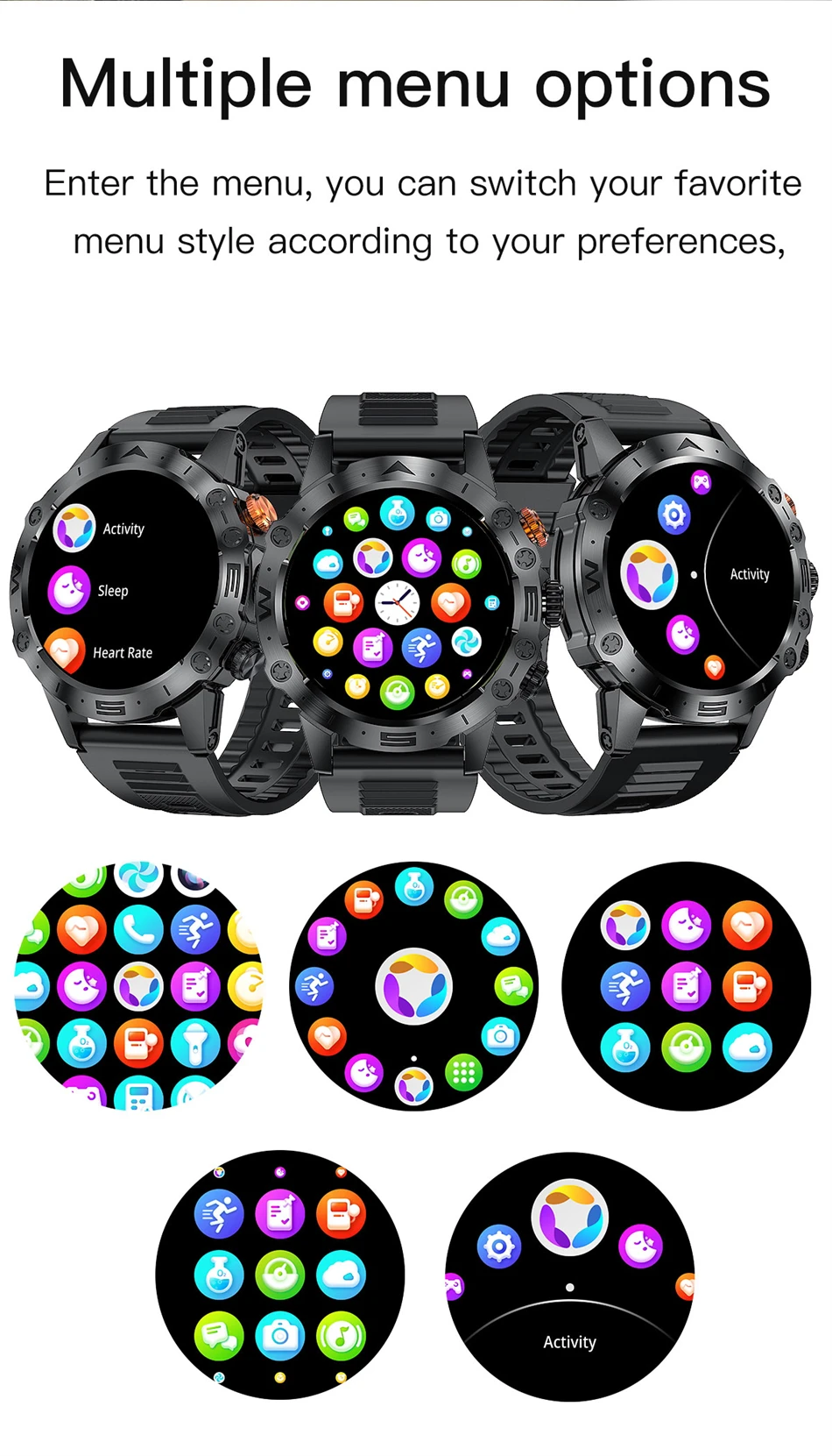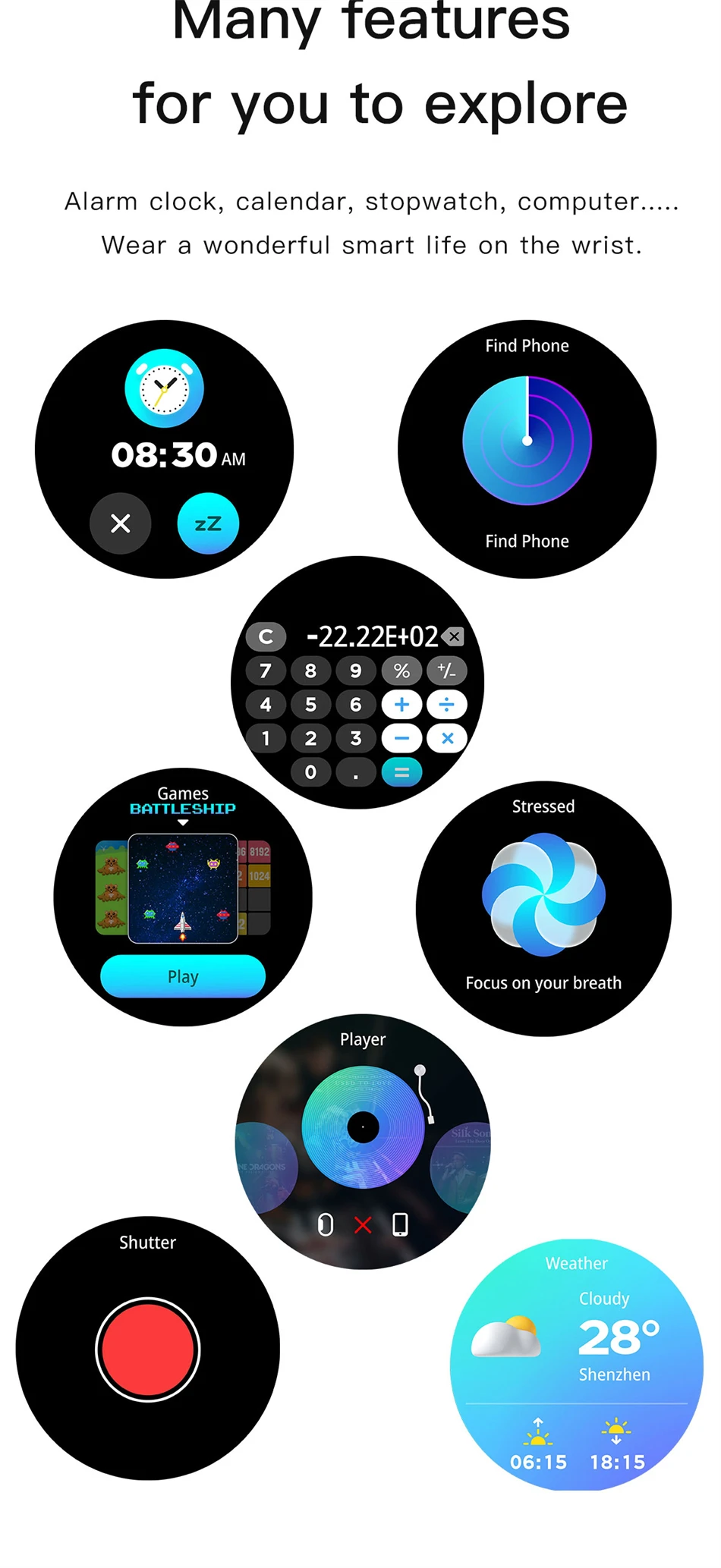Functions: Bluetooth call, multiple sets of menu styles, support 200 dials, breathing training, custom dials, stopwatch, brightness adjustment, multi-sport mode, sleep monitoring, real heart rate and blood oxygen , Voice assistant, message push, remote music, remote photo, real-time weather, find mobile phone (connected to the phone to use), bluetooth music playback, calculator, split-screen display, weather, alarm clock Sedentary reminder, Pedometer: Exercise pedometer, calorie consumption, exercise mileage log.