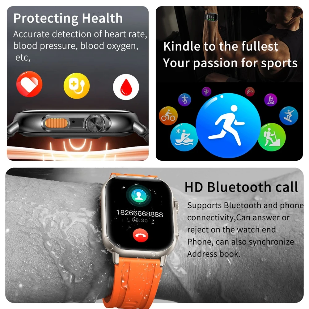 Product Description: HD call, information push, health monitoring management, one key multi-sport mode, built-in 10+1 beautiful dial; rotating crown magnetic fast charging, program dock + waterfall flow, AAC1210 speakers, vacuum plating super texture 2.02 “HD display, 5D dot process 8918F64M large memory, NFC built-in games IP68 waterproof.