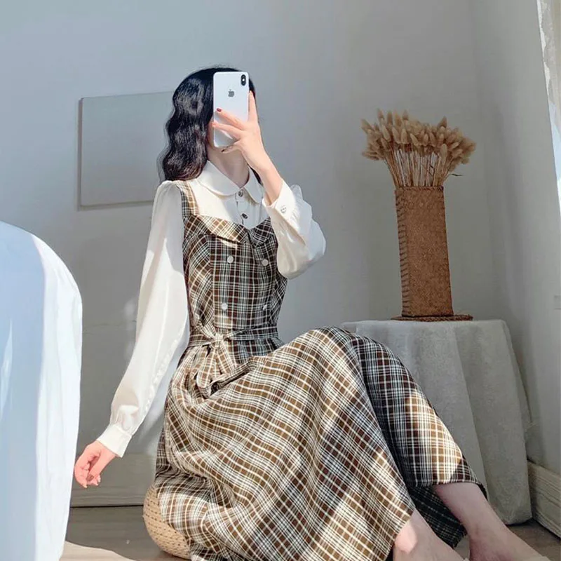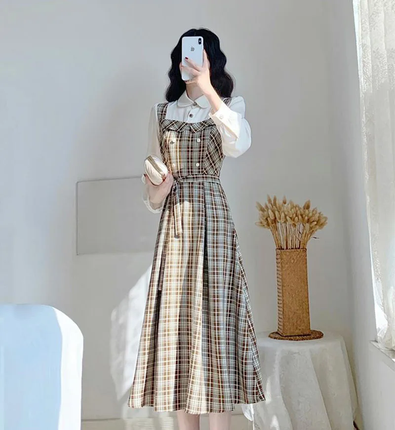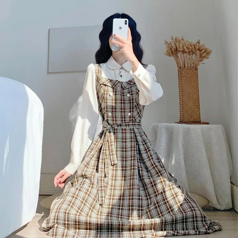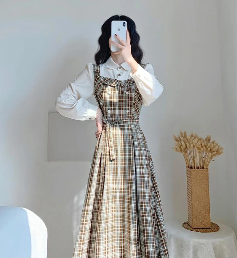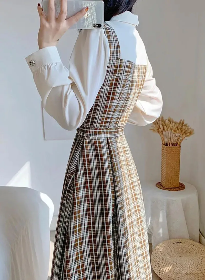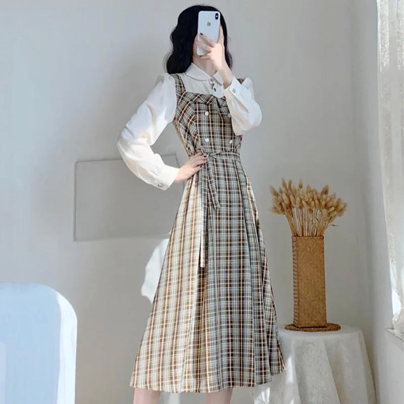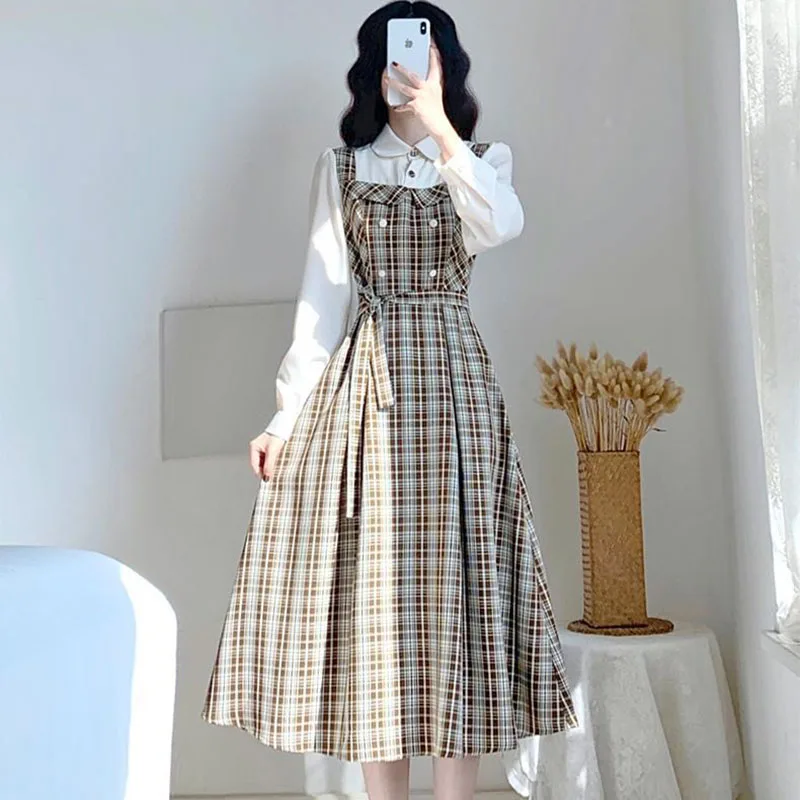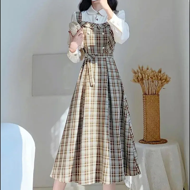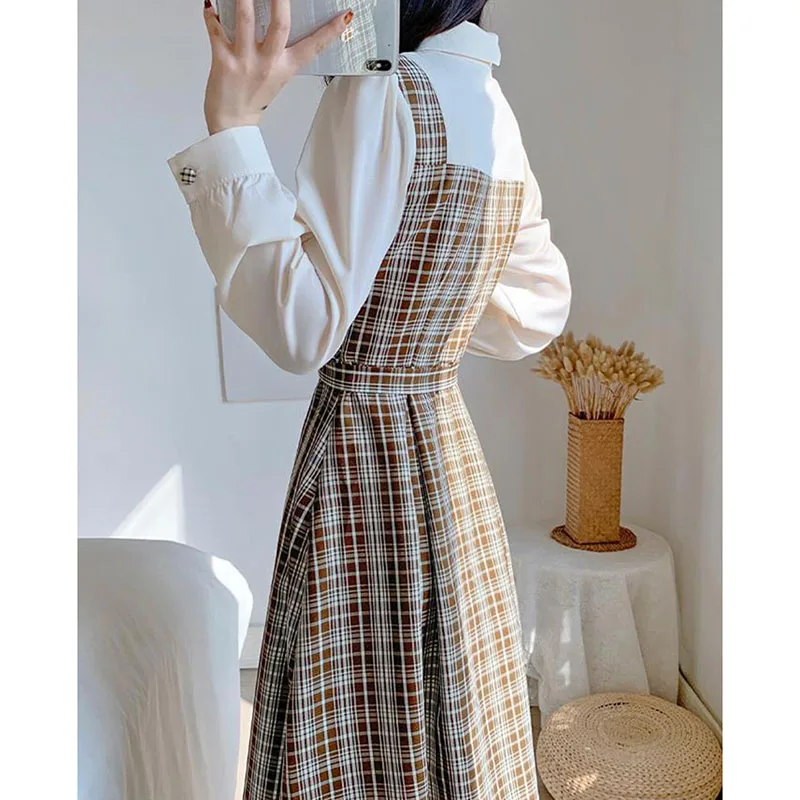 French Vintage Plaid Dress Women Fake Two Pieces Autumn Preppy Style Vestidos Elegant Patchwork Long Sleeve Dress