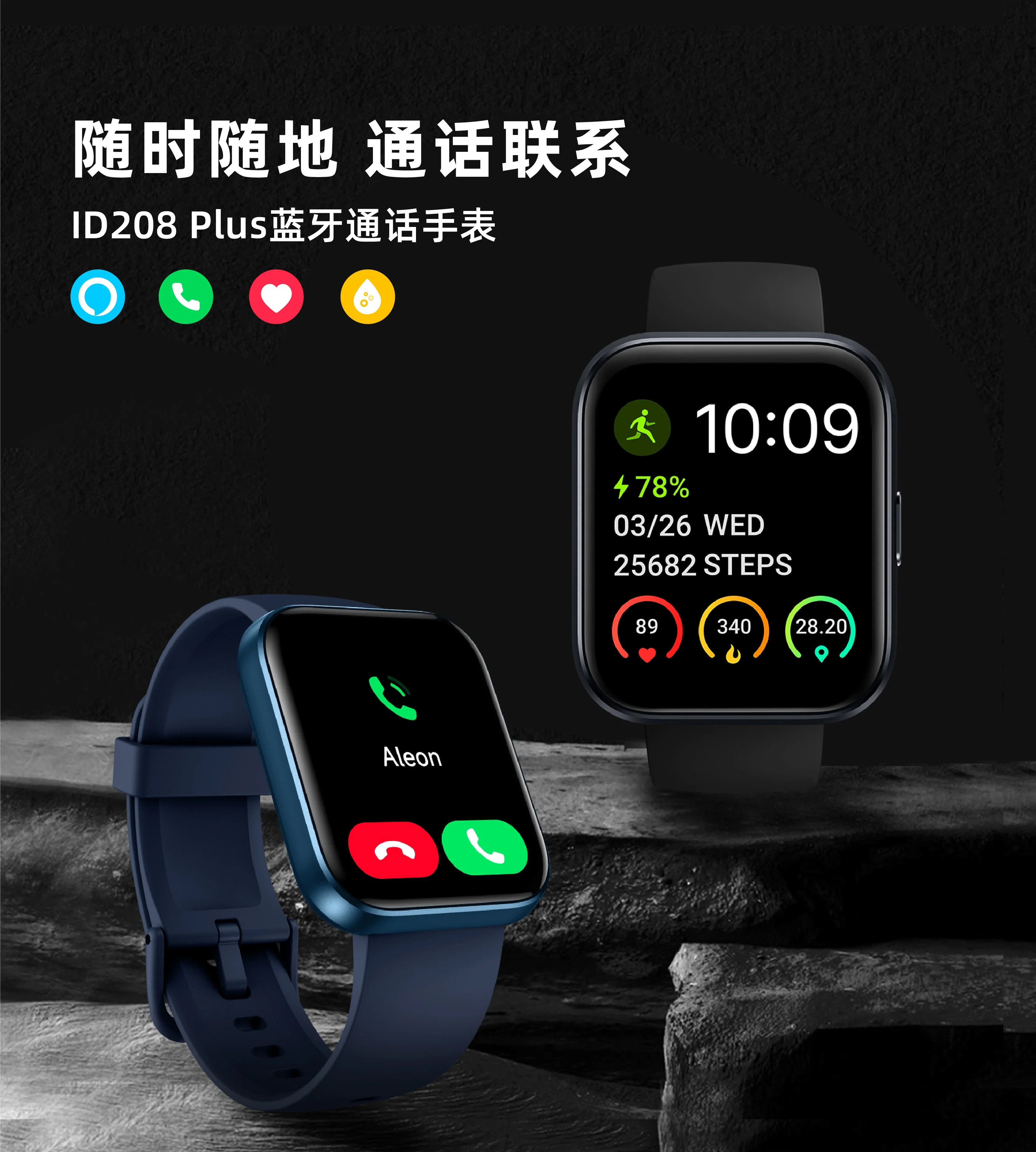 【1.8 Inch Screen】: The ID208BT smart watch with 240*284 high-definition large screen, the case is fine matte effect, partial gloss, injection blue natural color, more anti-dirty, morecorrosion-resistant, mirror polished, showing a crystal clear texture, low-key and subtle.