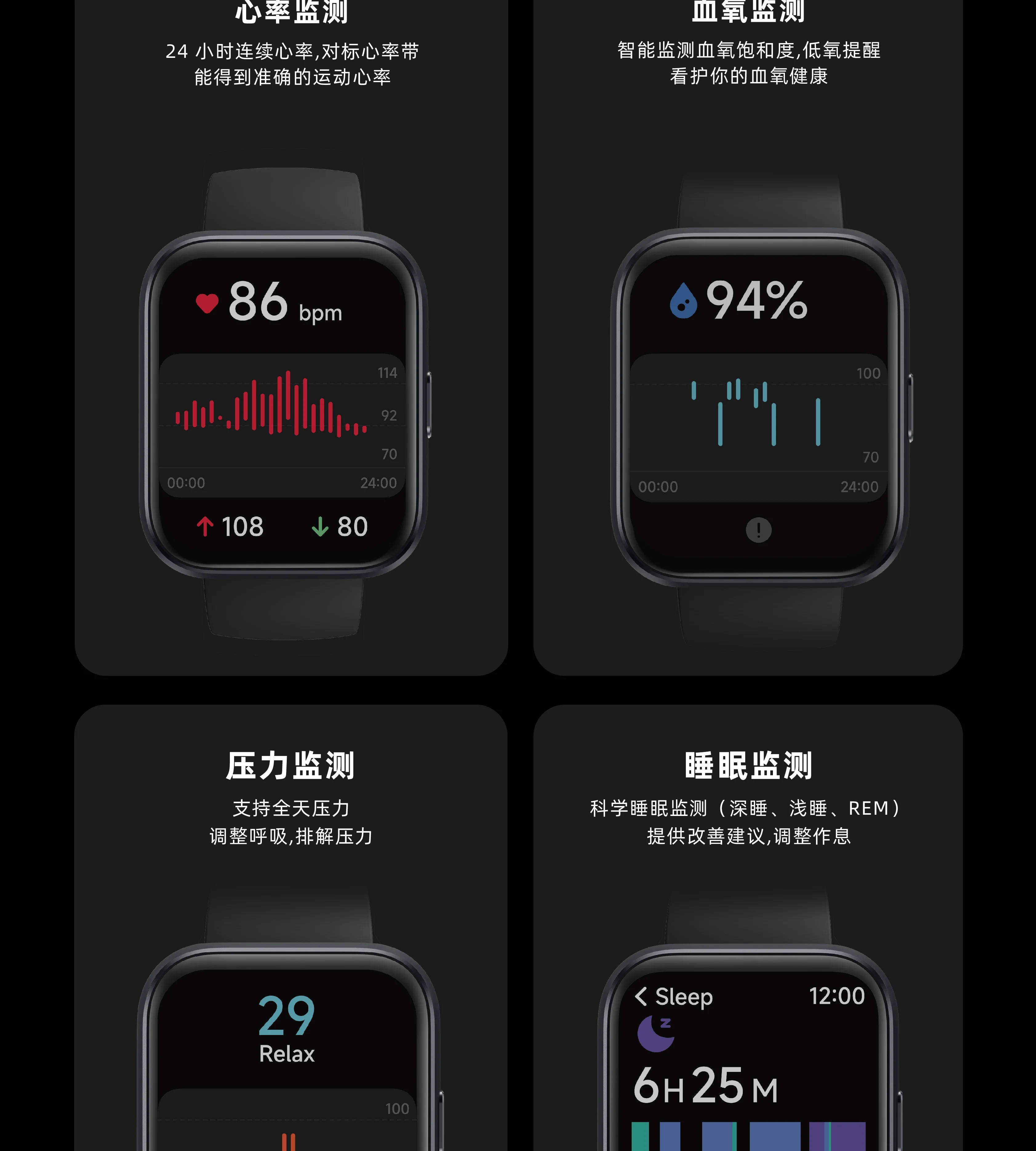 - Metrics measured: Heart Rate Monitor,Blood Oxygen Monitor,Sleep Monitor,Stress Monitor